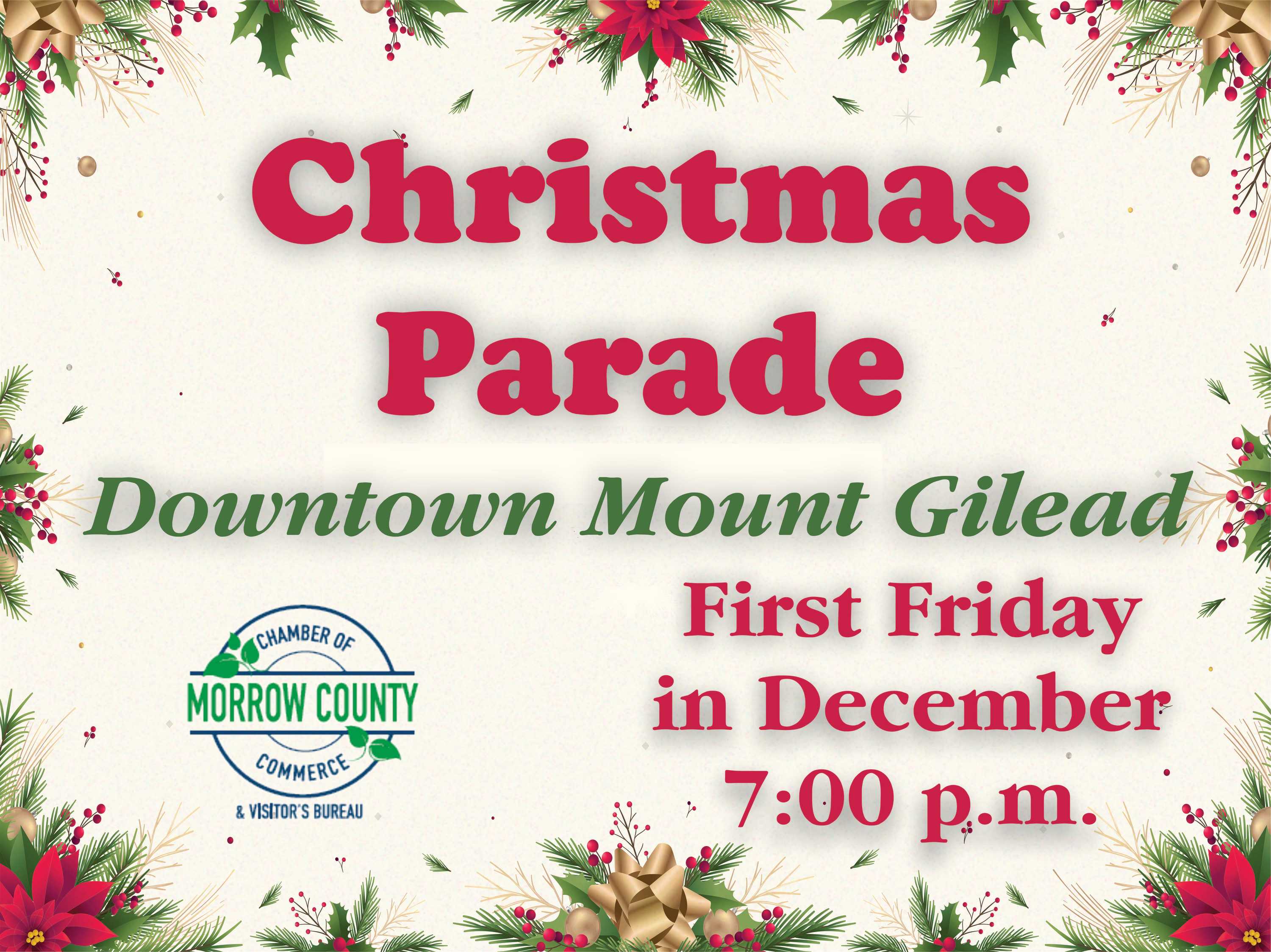 Save the Date! This is THE Christmas Parade of Morrow County and is put on by the Morrow County Chamber of Commerce. Come see Santa! Experience the joy of the season through the sights, the sounds, and the lights of Christmas. Each float is lit up for the occasion. The parade kicks off at 7:00 with downtown activities beginning at 5:00.